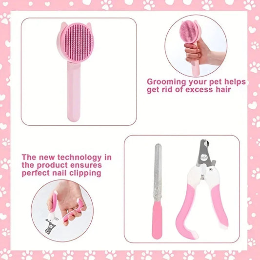 8Pcs Cat Brush Beauty Kit with Pet Nail Clippers and Files Pet Self-Cleaning Kit Flea Comb Pet Shampoo Bath Brush Pet Sheddin